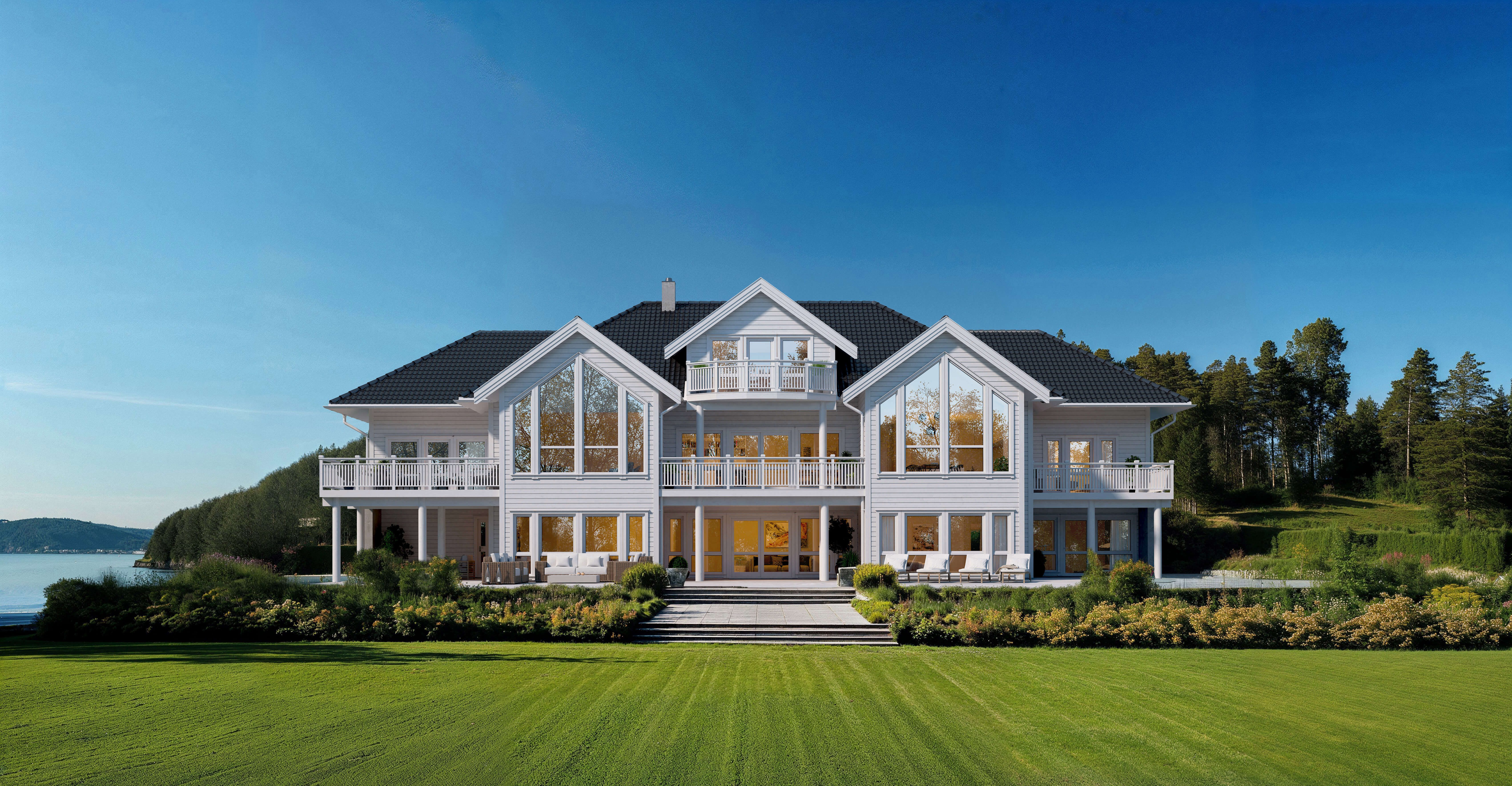 Boligen har seks soverom, seks bad, trimrom, stort kontor, tre stuer, en romslig kjøkkenløsning og uteområder som kan nytes uansett hvilken etasje du befinner deg i. Walk-in garderober og praktisk vaskerom sørger for orden i det daglige.