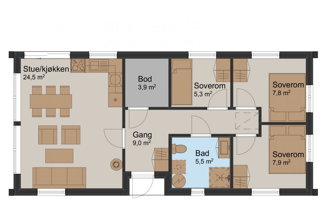 Kantarell er en fleksibel hytte du kan plassere på de fleste hyttetomter. Fra et lunt inngangsparti kommer du inn i gangen hvor du har du plass til en garderobe. Herfra kommer du til hyttens tre soverom, bad og allrom – som er en åpen stue-/kjøkkenløsning i moderne utførelse.