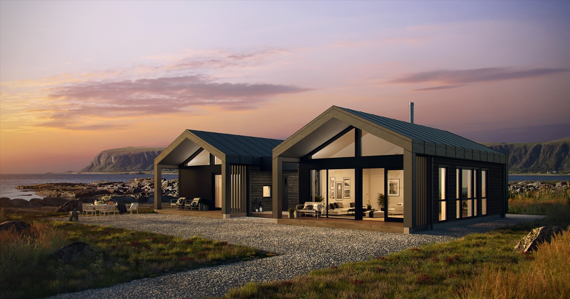 Lepsøy er en stor og luksuriøs hytte med en spennende fasade bestående av glass, fasadeplater og liggende kledning. Takplater i stål bygger opp om den moderne fasaden og skaper en gjennomført, stilren hytte.