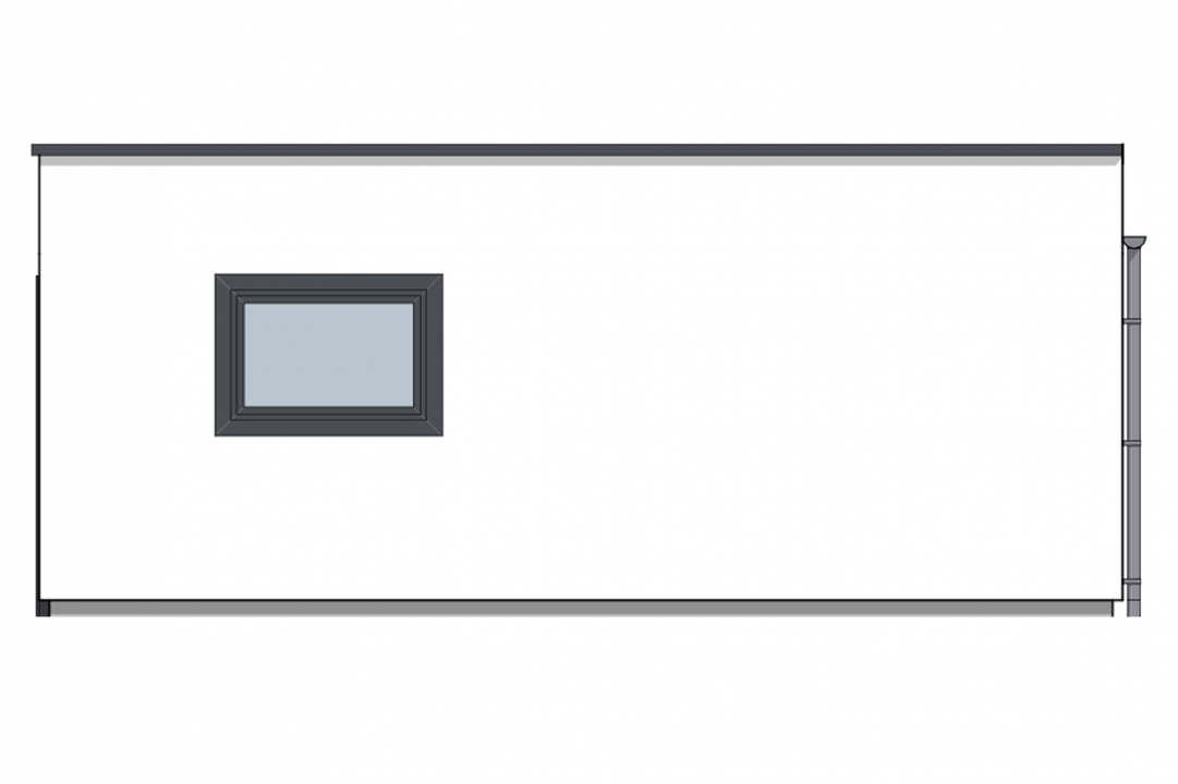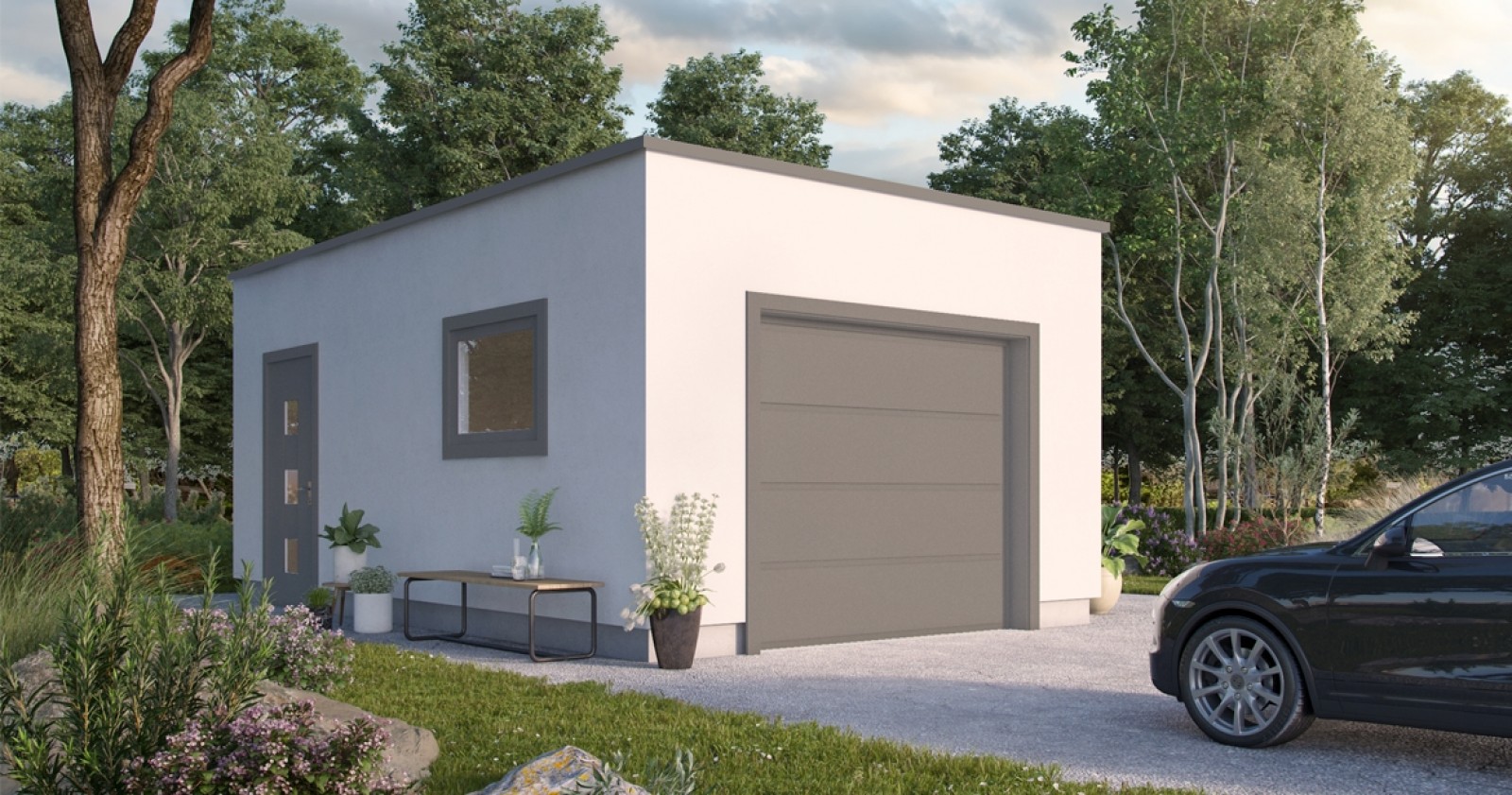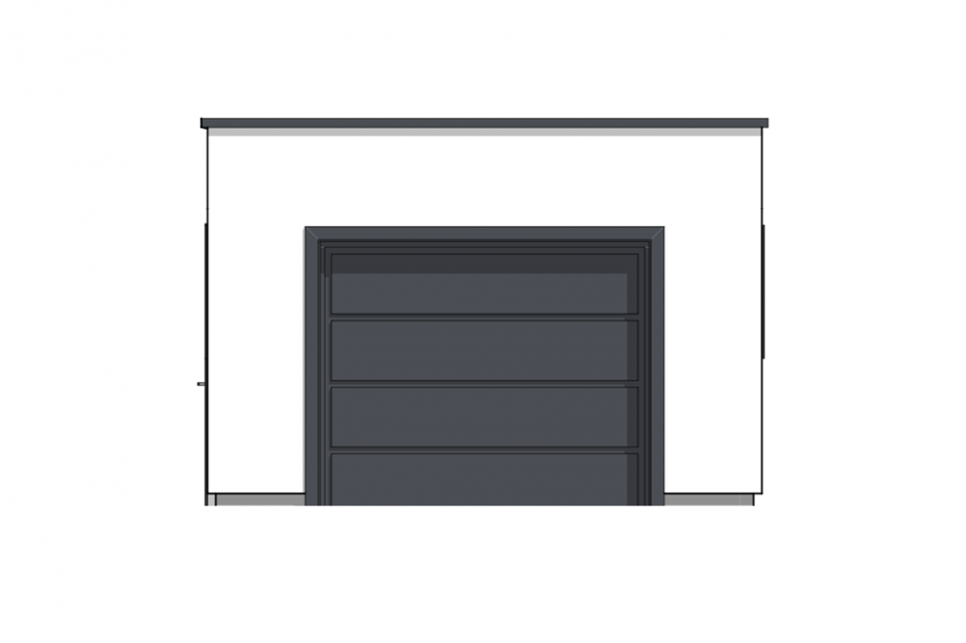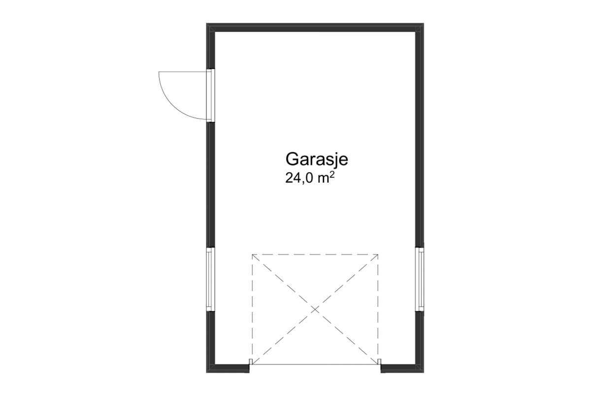 Enkel, stilren og tidsriktig garasje med flatt tak og detaljer som går godt sammen med en bolig i funkis-stil. Fasaden til bygget kan pusses eller kles med fasadeplater for å fremheve garasjens moderne uttrykk.